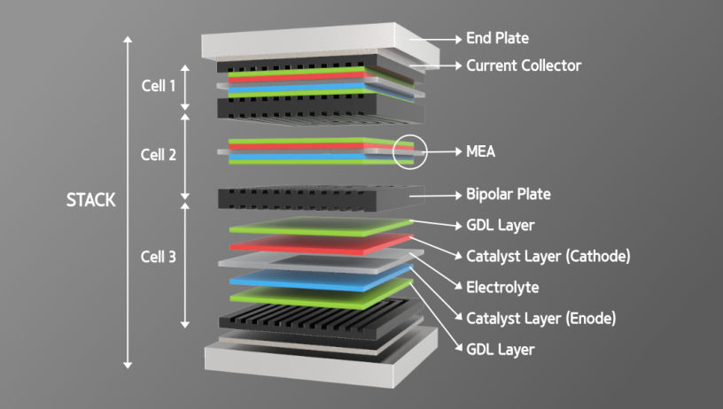 연료전지는 화학반응에 의한 친환경 전기 에너지를 생산하는 발전기술로 수소와 산소의 전기 화학적 반응을 일으키는 장치(STACK)로 반응시 분리도는 전자의 이동을 통해 전기를 생산 합니다. 수소와 산소의 반응 결과물은 순수한 물로 환경 오염이 없습니다.