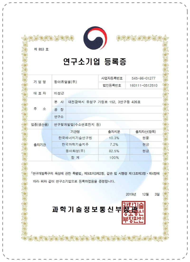 한국에너지기술연구원 기술 이전 (4억) 및 현물 출자(5억) 2019.11.11