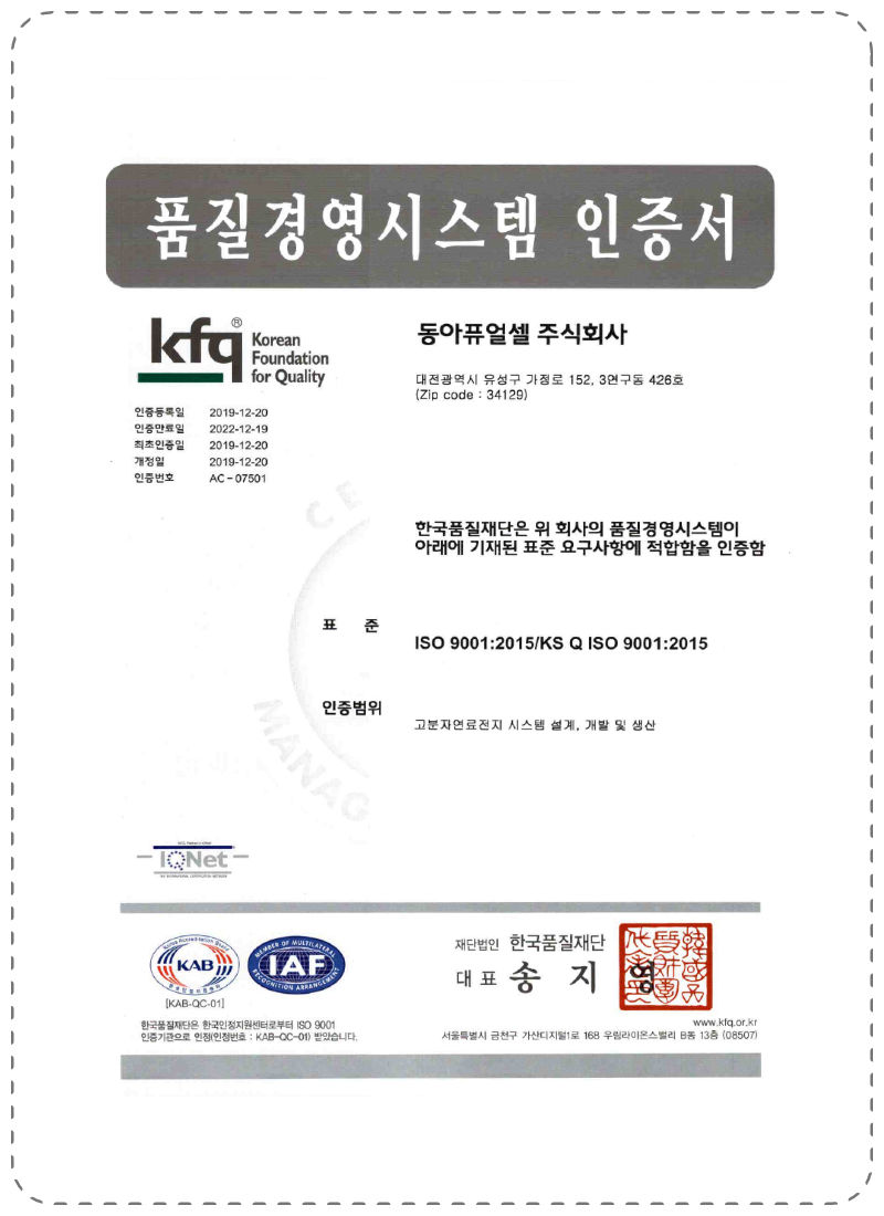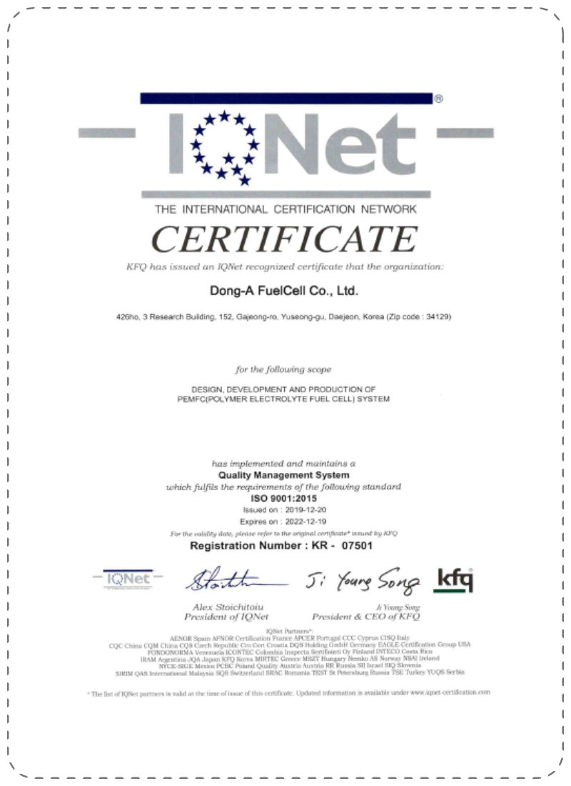 한국 품질재단으로 부터 ISO 9001 인증 획득 2019.12.12