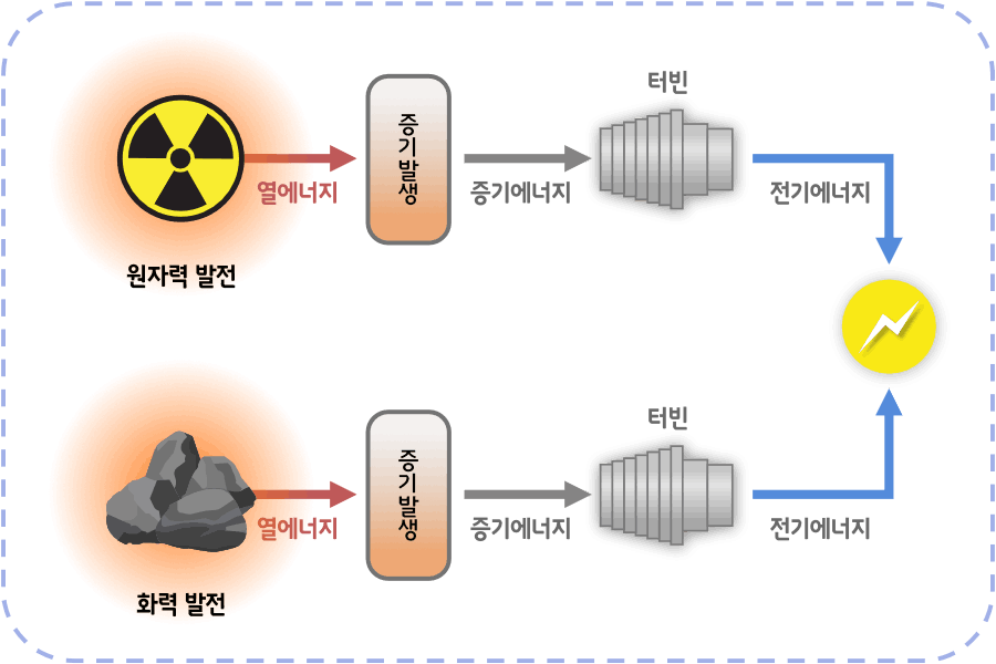 기존 전기 생산 방식은 원자력, 화력의 열을 이용해 발생한 수증기의 물리적 힘으로 터빈을 돌려 전기를 생산하는 방법을 사용합니다. 원자력발전은 방사능 물질을 화력발전은 다량의 탄소(C)가 발생되어 환경에 영향을 미치게 됩니다.