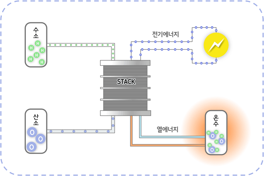 연료전지는 수소와 산소의 전기 화학적 반응을 일으키는 장치 (STACK)로 반응시 분리되는 전자의 이동을 통해 전기를 생산 합니다. 이때 발생되는 열에너지도 다양한 방법으로 사용합니다. 수소와 산소의 반응 결과물은 순수한 물로 환경 오염이 없습니다.