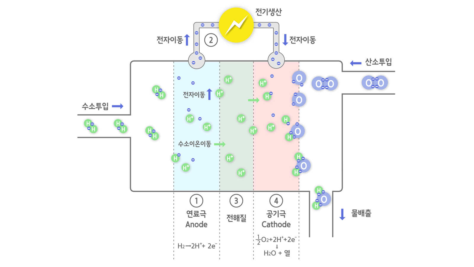 ① 연료극에서는 촉매가 수소와 전자를 분리 하는 과정에서 수소는 전자를 잃어 수소이온이 됩니다. ② 연료극에서 분리된 전자는 회로를 통해 공기극으로 이동하는데 이때 전기가 생산 됩니다. ③ 전해질 (이온교환막)은 이온만 이동이 가능하여 수소이온은 공기극으로 이동합니다. ④ 공기극에서는 산소, 수소이온, 전자가 결합하여 물이 생성됩니다. * 연료극과 공기극의 화학반응을 빠르게 하기 위해 촉매를 사용합니다.