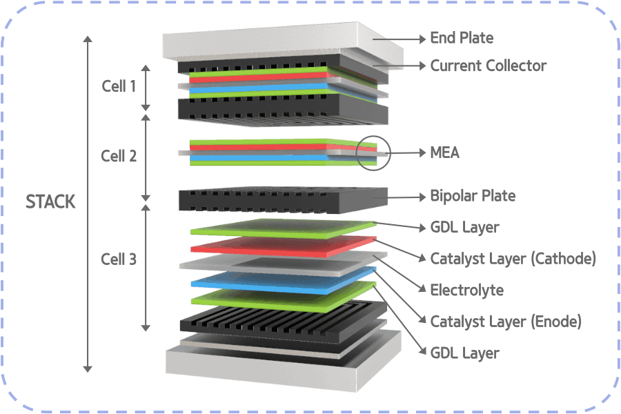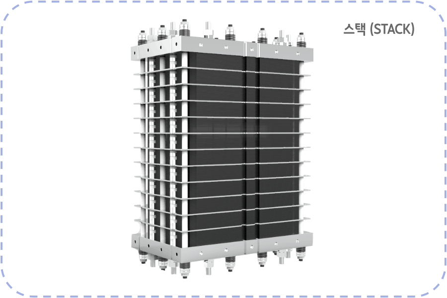 단일 연료전지를 여러겹으로 쌓아 대용량의 전기를 생산하는 장치.